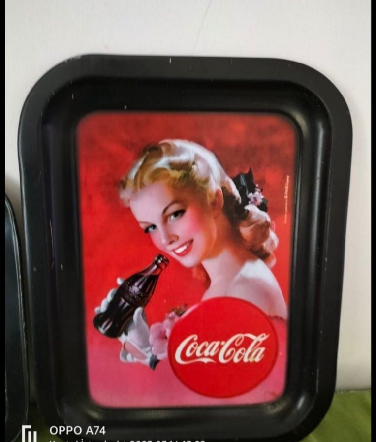 Retro Coca-Cola reklamı bulunan, bir kadının şişe tuttuğu metal tepsi. Klasik tarz ve pratik kullanım sunar. ️ Ufak çizikler olabilir. Adet 500 lira. 3 Adet 1500 lira.