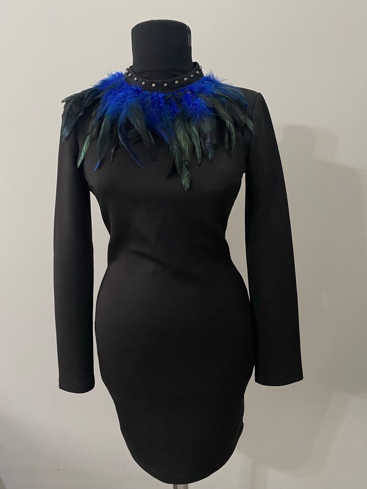Uzun kollu, yakalı, kürk detaylı siyah mini elbise vücudu saran bir kumaşa sahip Avant-garde tarzda parti için uygun.