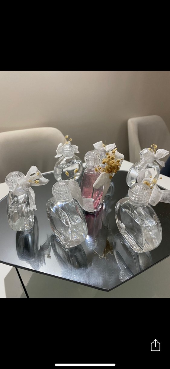 Şeffaf cam ve beyaz fiyonklarla süslenmiş, kurutulmuş çiçek detaylı zarif kolonya şişeleri seti. Hediyelik içi kolonya dolu olarak gönderilecek