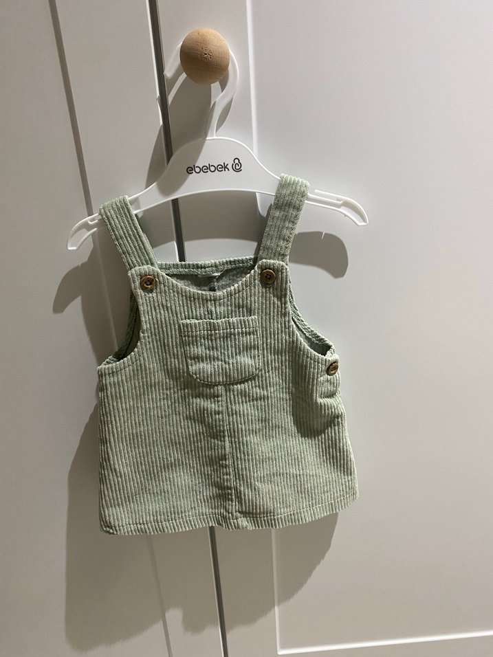 Yeşik kolsuz, askılı ve düğmeli kız çocuk elbisesi, kadife kumaştan ve bol kesimlidir. Önünde küçük cep vardır, desensiz sade bir modeldir.