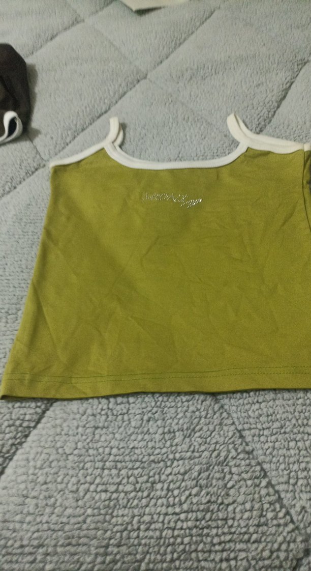 Kolsuz, straplez yakalı, yeşil renk kız çocuk bluzu. Yumuşak kumaştan, basic ve sokak modasına uygun, vücuda oturan kesim.