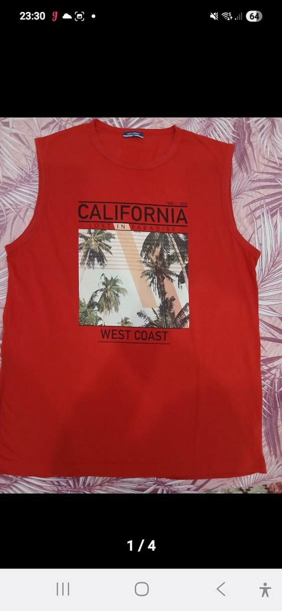 Kolsuz, bol kesim kırmızı erkek tişörtü, yuvarlak yaka ve palmiye ağaçları baskısı ile CALIFORNIA ve WEST COAST yazılıdır. Sentetik kumaştan üretilmiştir.
