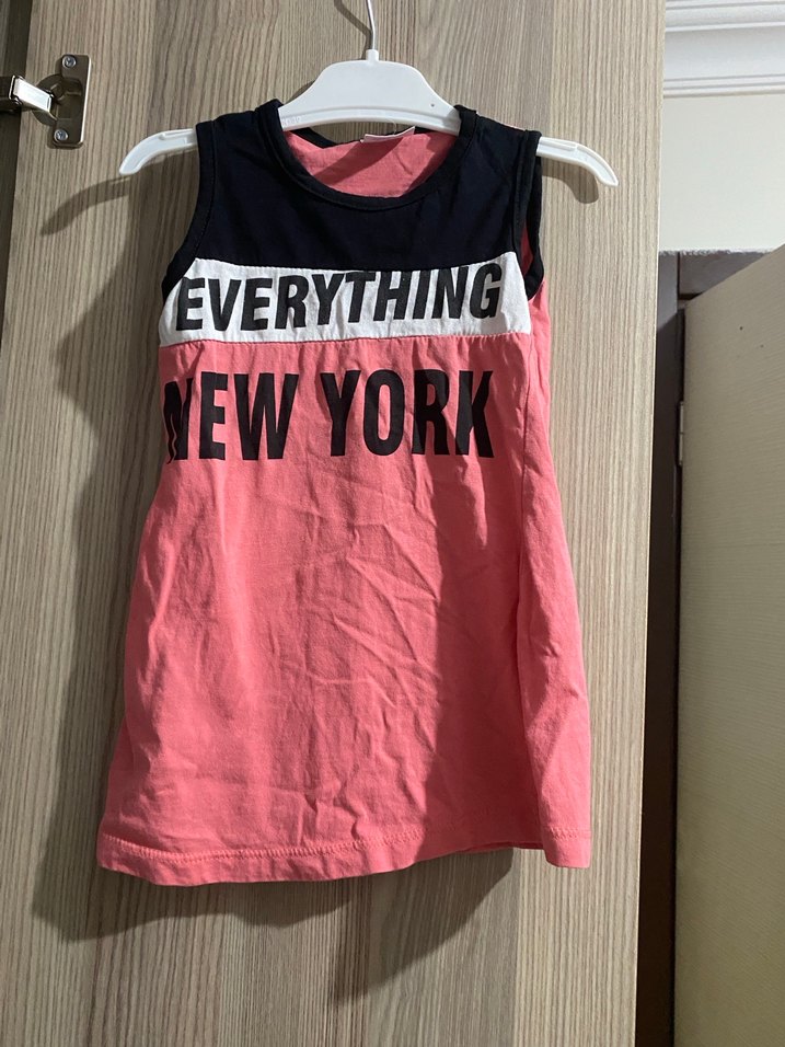 Kolsuz, dar kesim kız tişörtü, renkli baskılı ve fırfırlı detaylı. Üst kısmında "EVERYTHING NEW YORK" yazısı bulunur.
