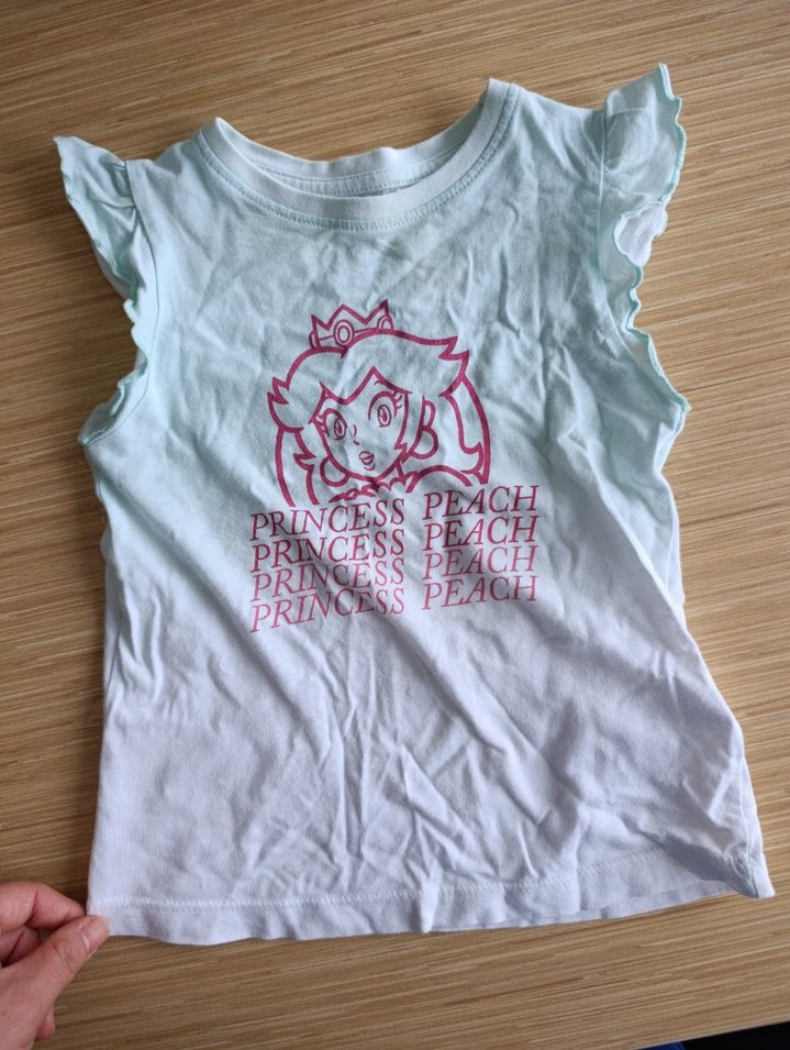 Kolsuz, oturan kesim kız çocuk tişörtü, yumuşak kumaş üzerine baskılı Princess Peach figürü ile trendy casual tarz için uygun.
