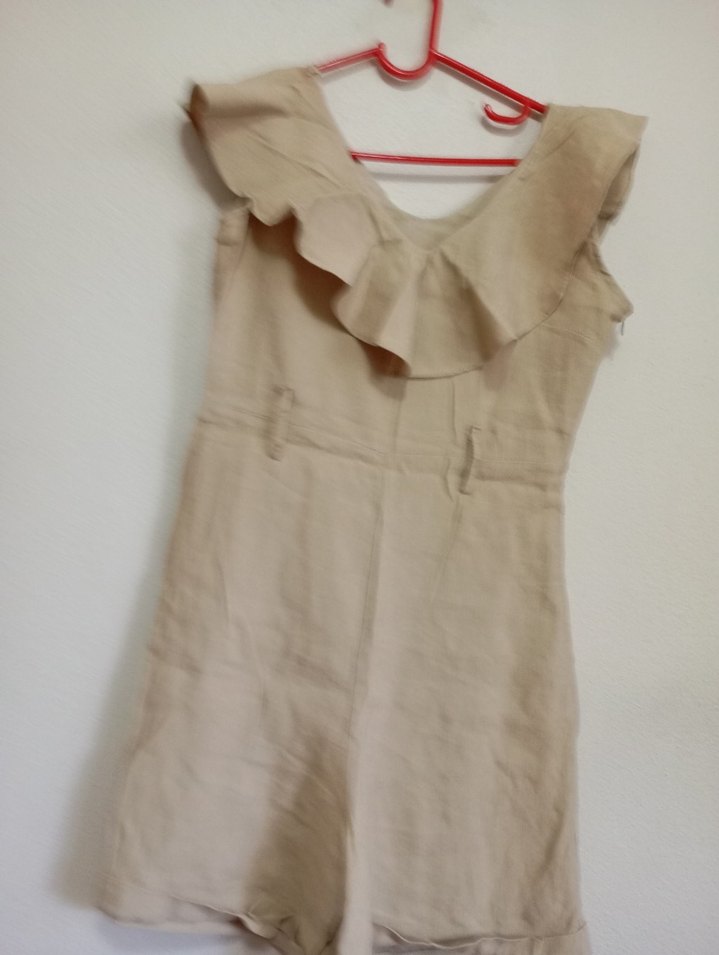 Bej renkli kolsuz keten tulum, V yaka ve fırfır detaylı. Bol kesim ve midi boyda, minimalist bohem tarzda. Günlük kullanıma uygun.kemeri var l etıketlı s ye uygundur