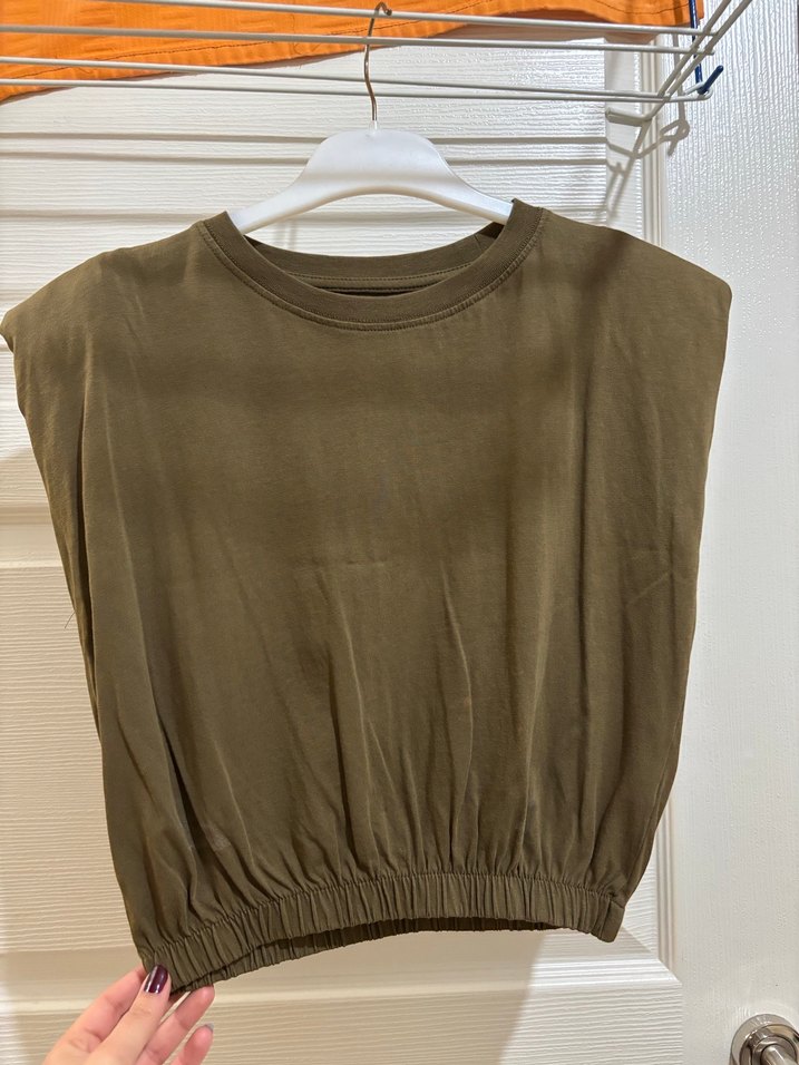 Kolsuz, bisiklet yaka ve bol kesime sahip bej renkli bluz, rahat ve yumuşak keten kumaştan, elastik bel detayıyla günlük sokak stiline uygun. Onunde kucuk leke var ama dikkat cekmiyor.