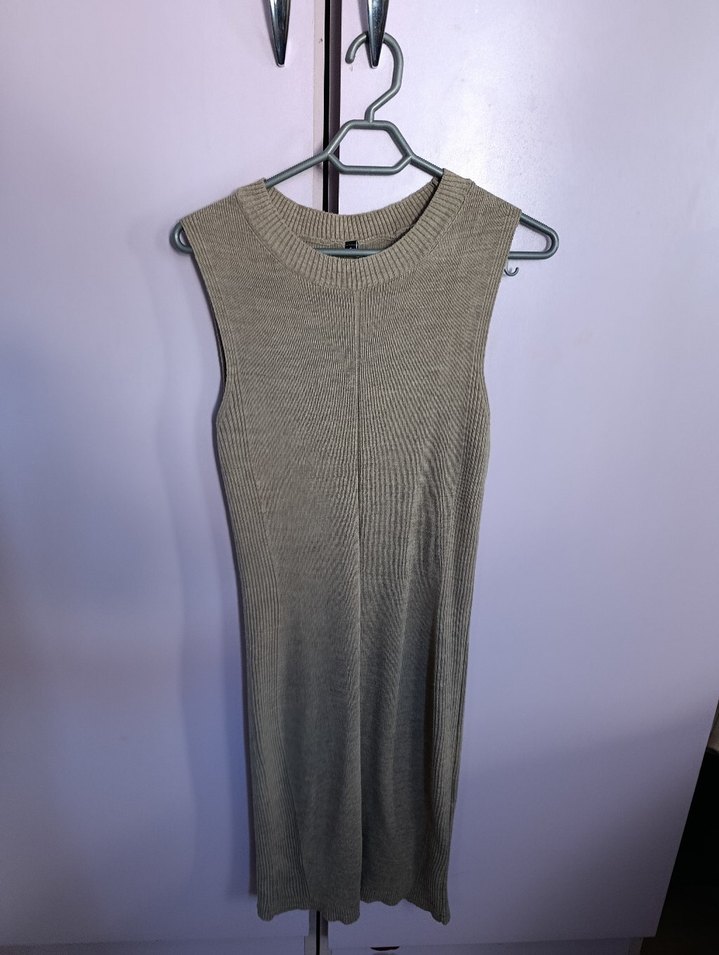 Yumuşak triko kumaştan, kolsuz, yüksek yakalı ve vücuda oturan bej triko midi elbise. Günlük sokak stiline uygundur.