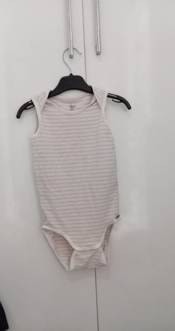 Kolsuz, gri ince çizgili beyaz bebek body, straplez yaka ve yumuşak kumaşla rahat kullanım sağlar.