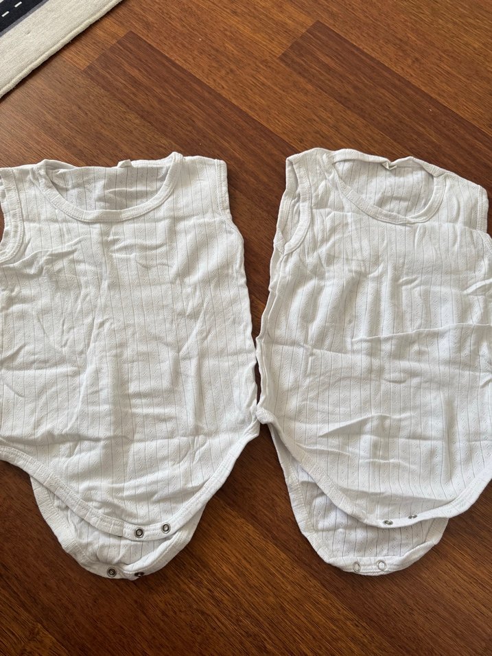 Yumuşak keten kumaştan, kolsuz beyaz bebek bodyler, yuvarlak yakalı ve sade tasarımlı, rahat kullanım sağlar. Kullanılmamıştır 1.5 2 yaş için uygun
