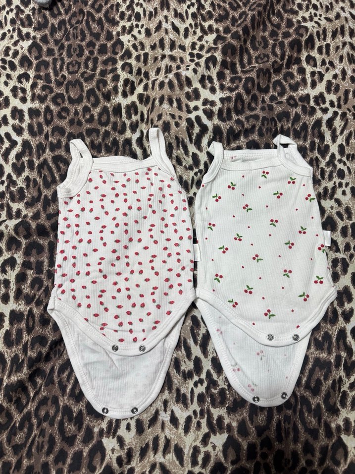 Kolsuz, askılı beyaz bebek bodyleri dantel detaylıdır. Renkli küçük desenler ve kolay giydirme için çıtçıtlar bulunur.