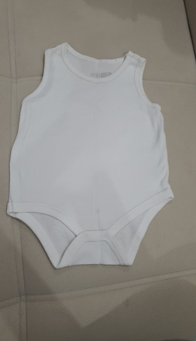 Yumuşak kumaştan, kolsuz ve yuvarlak yakalı beyaz bebek erkek body. Sade ve şık tasarım. küçük bir leke var hafif çıkabilir