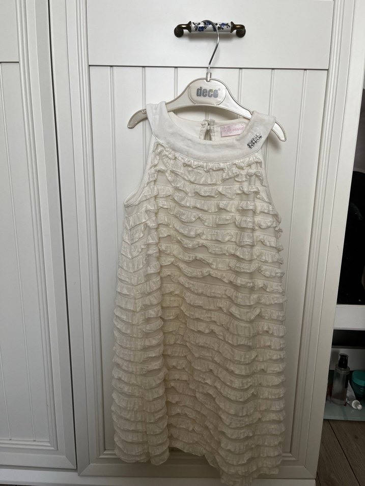 Kolsuz, beyaz keten elbise; fırfır ve nakış detaylarına sahip. Yuvarlak yaka ve bol kesim ile klasik bohem tarzında.