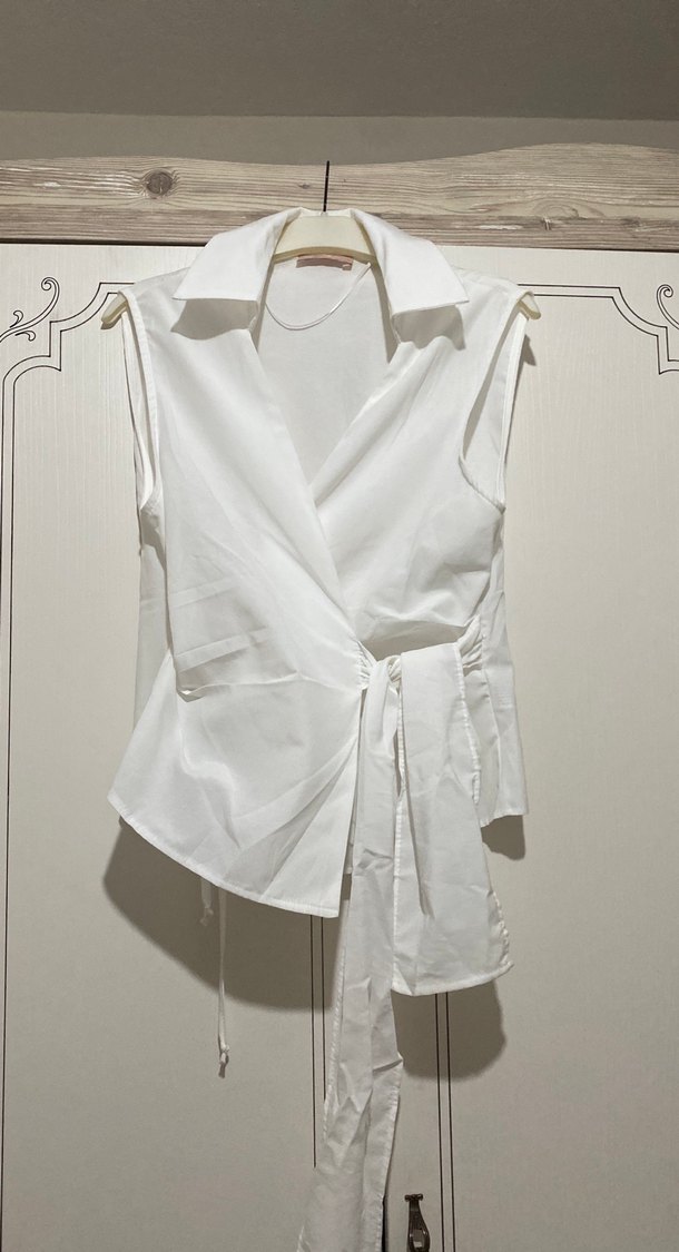 Kolsuz beyaz keten gömlek, halter yaka ve kemerli bel detayına sahiptir. Kısa boy ve regular fit ile minimalist, çağdaş bir stil sunar.