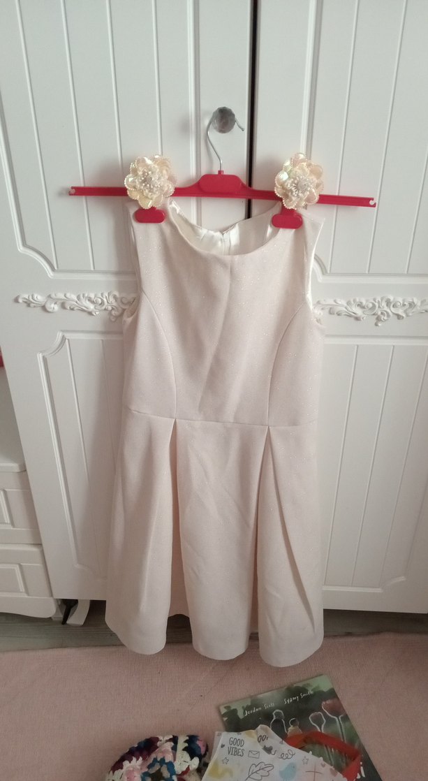 Kolsuz, askısız beyaz keten kız elbisesi, pileli ve bol kesim. kendinden simli cukarılabilinen fiyonk kemeri var ve iki saç tokası var