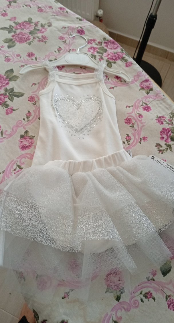 Kolsuz, straplez yakalı ve fırfırlı detaylara sahip beyaz, ince dokulu sentetik kumaştan yapılmış kız çocuk elbisesi.