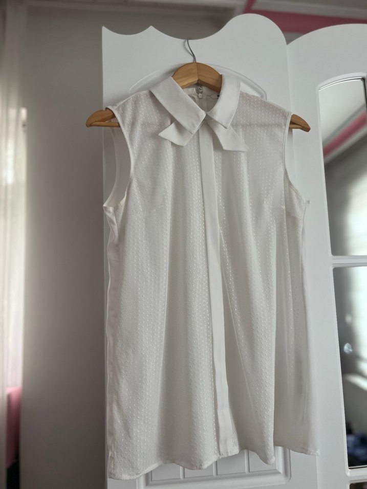 Kolsuz, beyaz, parlak keten kumaştan, yakalı ve pileli detaylara sahip midi uzunlukta klasik gömlek. Ofis için uygun, minimalist ve modern klasik tarzda.