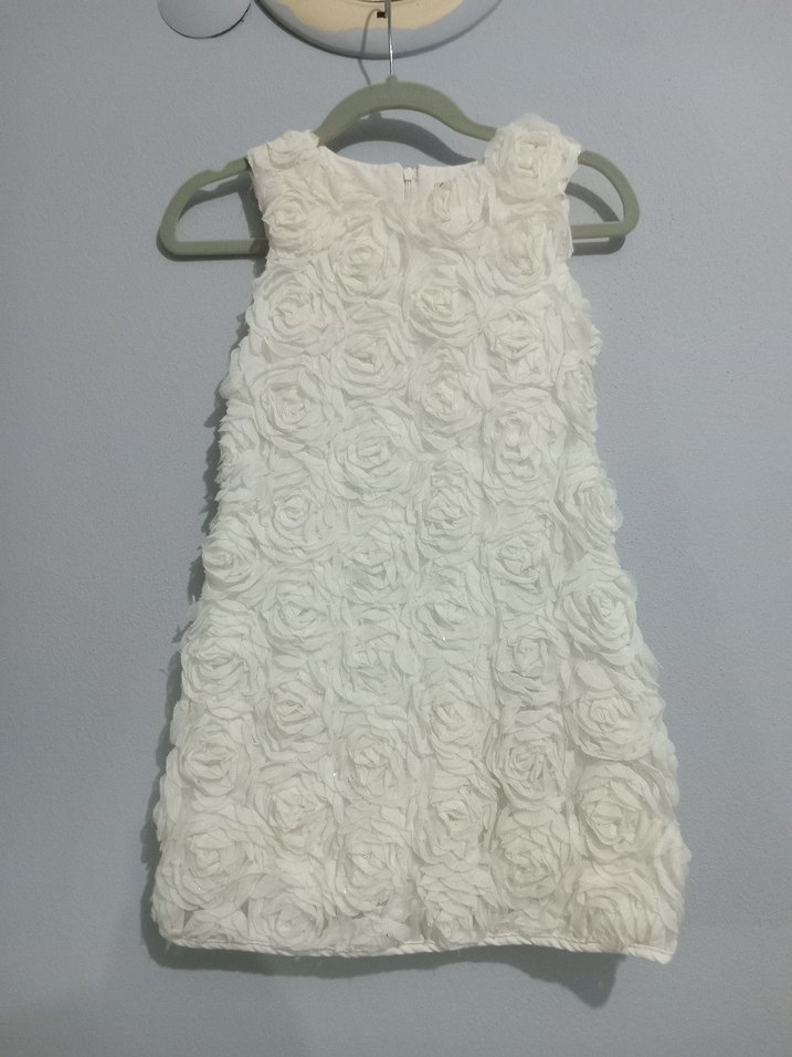 Kolsuz, beyaz nakışlı ve fırfırlı detaylara sahip kız elbisesi. Yumuşak sentetik kumaştan, bohem ve şık bir görünüme sahiptir.