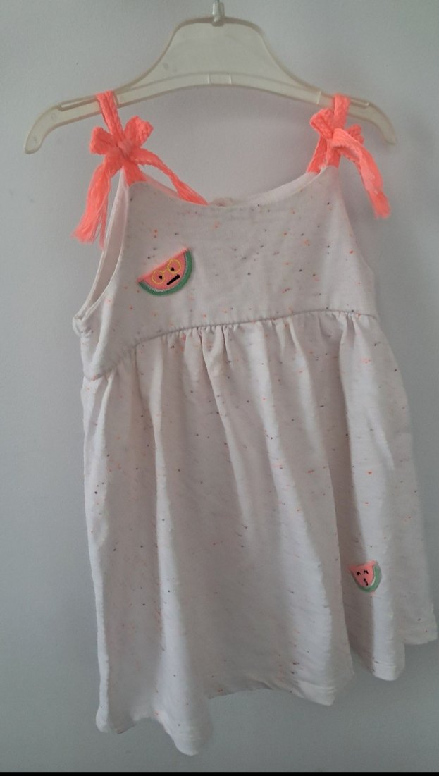 Kolsuz beyaz elbise, nakışlı karpuz desenleri ve fırfırlı askılarla rahat kesim sunar.