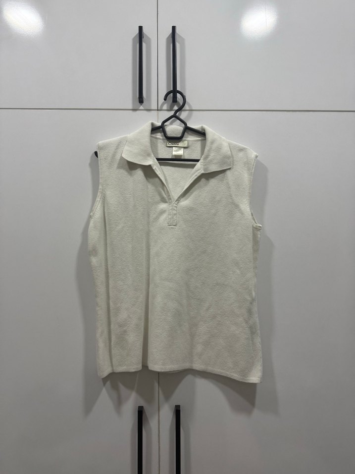 Kolsuz beyaz triko, yakalı ve bol kesimdir. Minimalist ve rahat şıklık sunar, günlük kullanıma uygundur.
