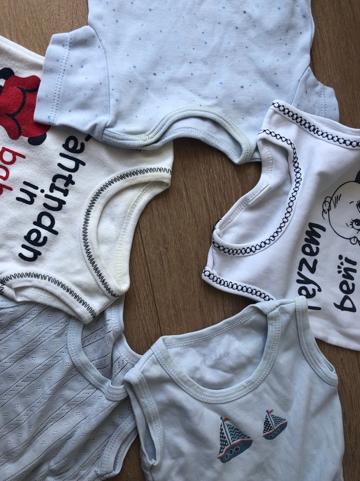 Pamuklu, kolsuz,erkek bebek body, yuvarlak yakalı ve sade tasarımlı. İkisinin yakasında hafif sararma var 3 ü mavi 2 si beyaz