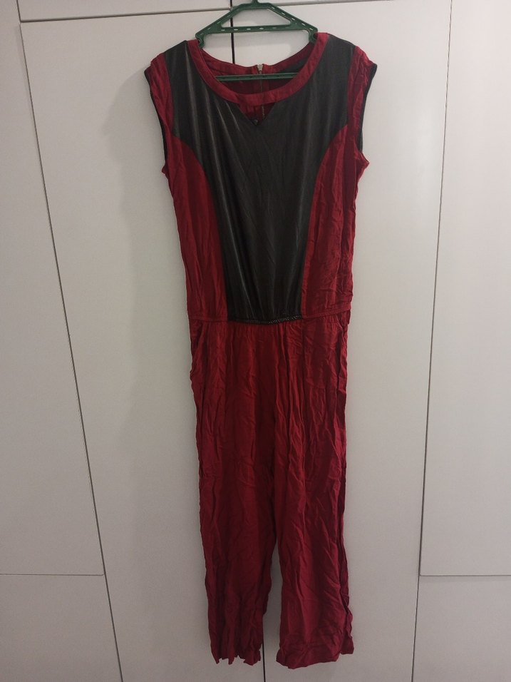 Kolsuz, v yaka ve drapeli tasarıma sahip bordo siyah tulum. Yumuşak sentetik kumaştan, günlük kullanım için uygun ve gotik tarzda.