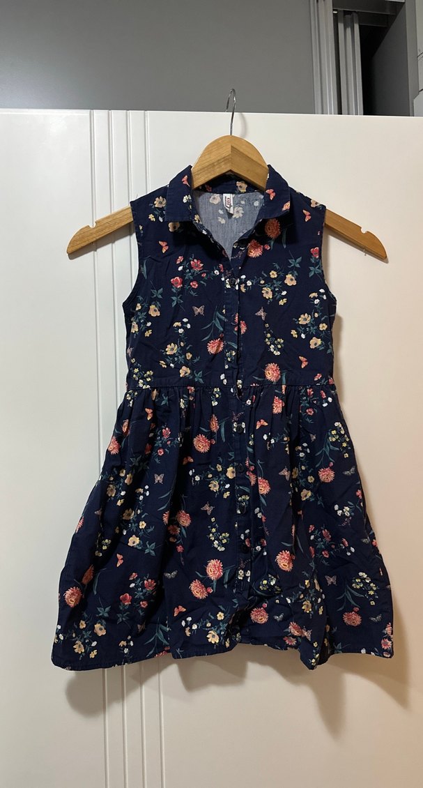 Kolsuz, yakalı ve düğmeli, oturan kesim kız elbisesi. Koyu renkli, çok renkli çiçek desenleriyle bohem tarzda.