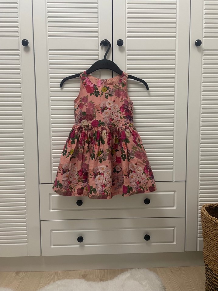 Kolsuz, çiçek desenli ve fırfırlı vintage tarzda, v yaka, dar kesim kız elbisesi. Yumuşak tekstil kumaştan üretilmiştir.