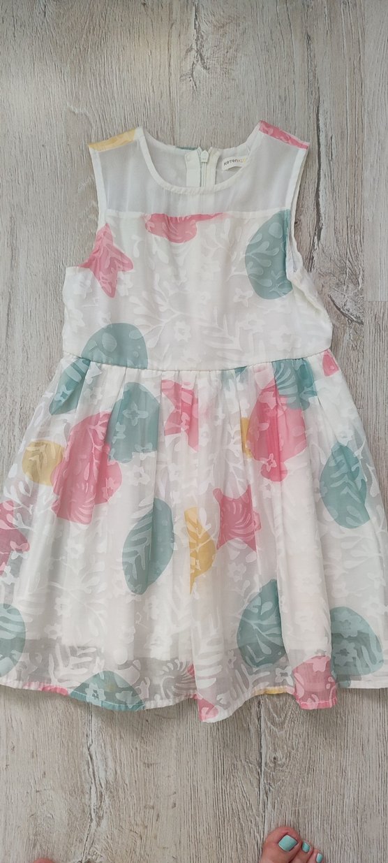 Kolsuz, straplez yakalı, bol kesim kız elbisesi. Pastel tonlarda batik desenli ve fırfırlı, yumuşak sentetik kumaştan üretilmiştir. Az giyildi ve nerdeyse yeni gibi. Düğün davet vs. giyilebilir, günlük kullanım için de uygun.