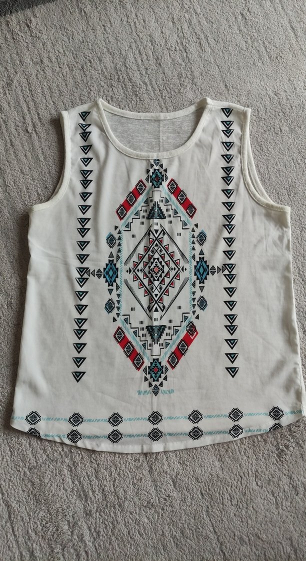 Baskılı geometrik desenlere sahip bohem kesim, kolsuz kadın bluz. Beyaz ve gri tonlarda, rahat kesim ve yuvarlak yaka.