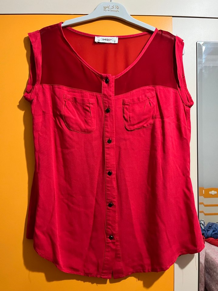 Kolsuz kırmızı kadın gömlek, düğmeli ön ve bol kesimlidir. Yumuşak tekstil kumaştan, straplez yakalı ve midi boyda, omuz kısmı tüldür, transparandır. Temiz ve hasarsızdır.