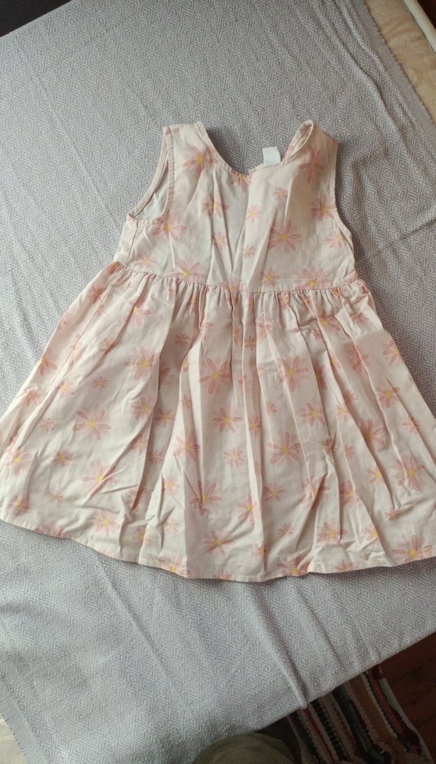 Kolsuz, düğmeli ve bol kesim kız elbisesi. Bej pastel renk ve batik desenli, askısız yakalı bohem tarzda.
