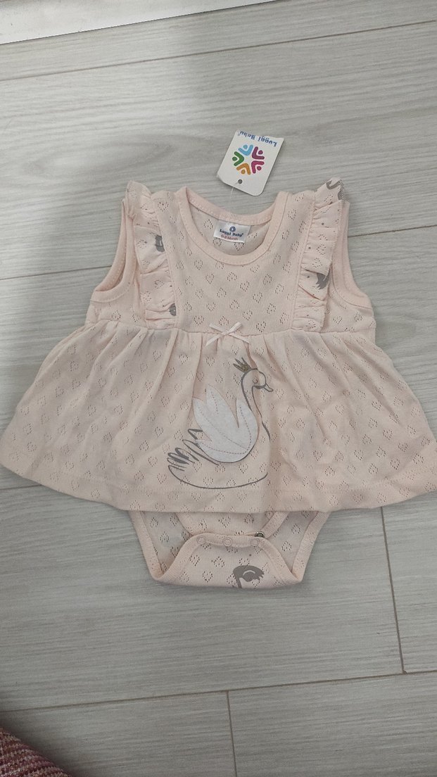 Kolsuz, fırfırlı detaylı ve işlemeli kuğu desenli bej tonlarında bebek body elbise, straplez kesime sahip.