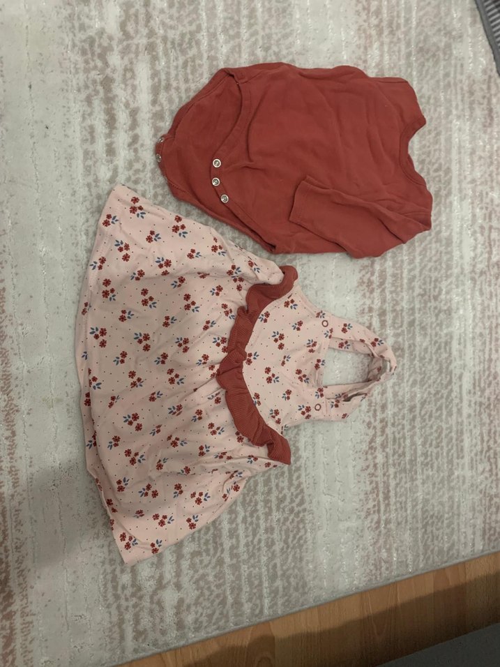 Pembe ve gri tonlarda, kolsuz bebek kız body ve çiçek desenli elbise seti. Elbise, fırfırlı detaylara ve straplez yakaya sahiptir.