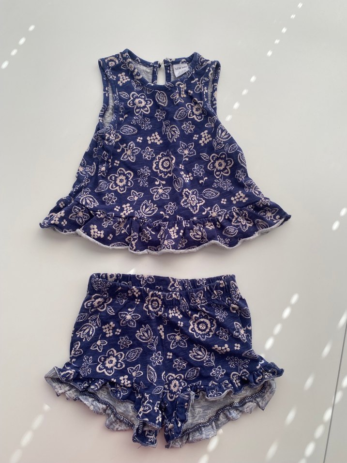 Kolsuz, renkli mavi batik desenli, üst ve şortta fırfır detaylı bebek kız takımı. 3.6 aylıktır