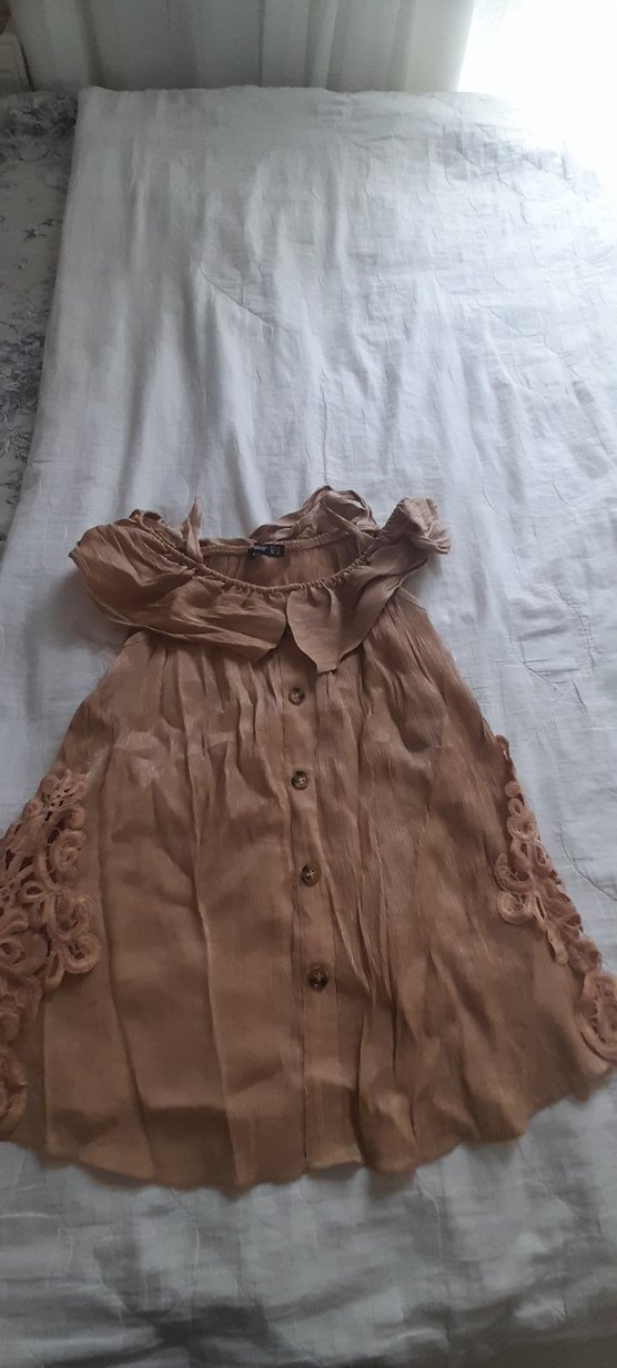 Kolsuz, fırfırlı detaylı bej keten bluz, straplez yakalı ve bol kesim bohem tarzda.