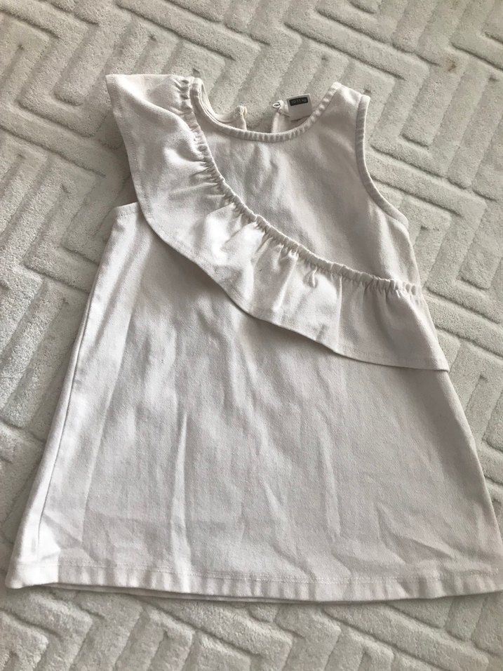 Kolsuz, yuvarlak yaka ve fırfır detaylı beyaz kız elbisesi, yumuşak keten kumaştan üretilmiştir. Rahat kesimi ve sade deseni vardır.