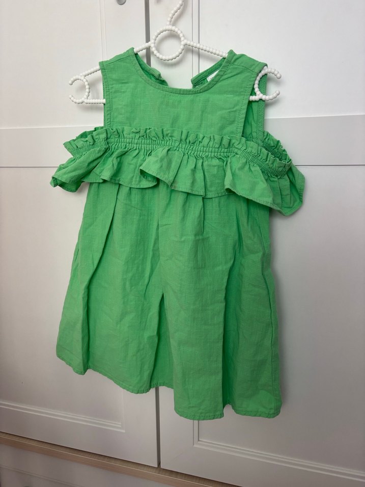 Kolsuz, fırfırlı detaylı yeşil keten elbise, straplez yakalı ve bol kesimdir. Yumuşak pastel tonunda, bohem tarzda.