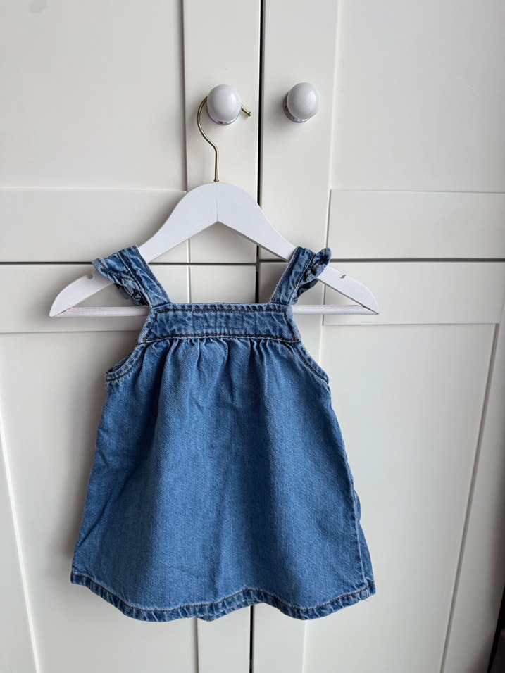 Kolsuz, fırfırlı detaylara sahip mavi kot elbise. Straplez yakalı ve bol kesimdir, sade ve düz tasarıma sahiptir.
