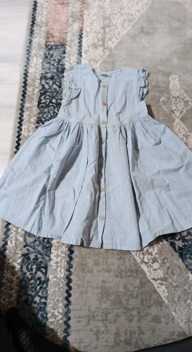 Kolsuz, fırfırlı detaylara sahip kot kumaştan yapılmış, önü düğmeli ve bol kesim kız çocuk elbisesi. Askısız yakaya sahiptir ve yumuşak mavi renktedir.