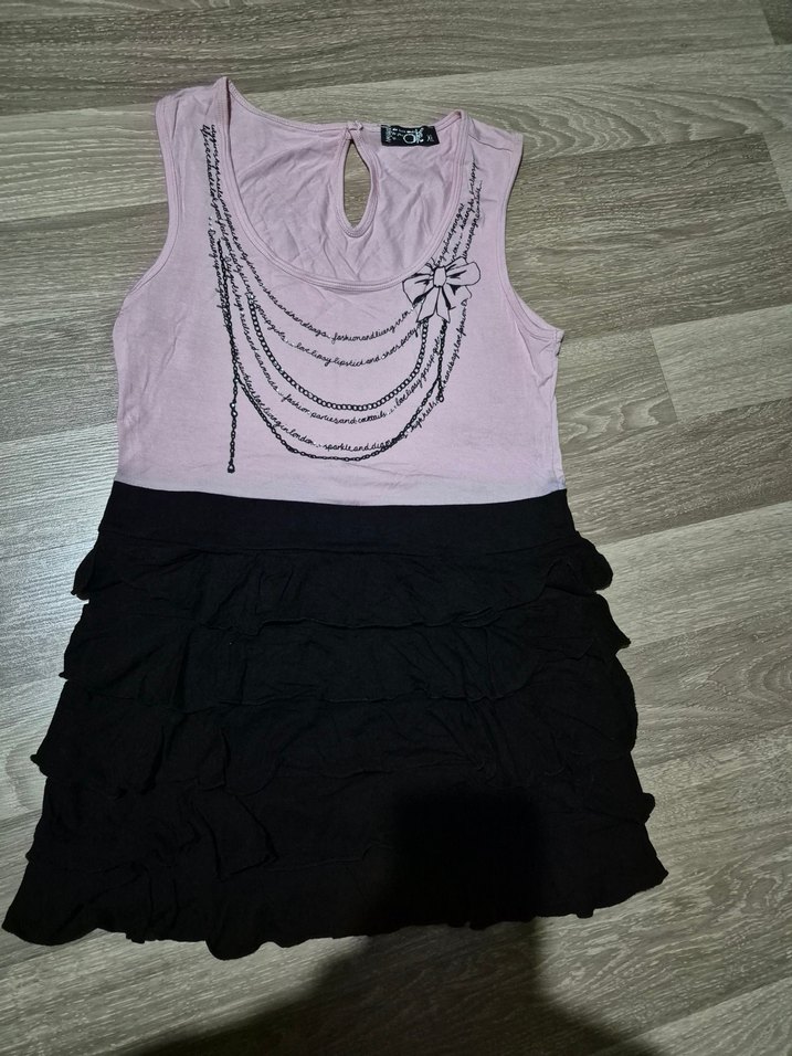 Kolsuz, bisiklet yaka, zincir ve fiyonk baskılı pembe üst kısmı ve siyah fırfırlı etek kısmı olan penye kumaş mini elbise. Koton Ole serisi XL yazıyor ama 40 beden için uygundur
