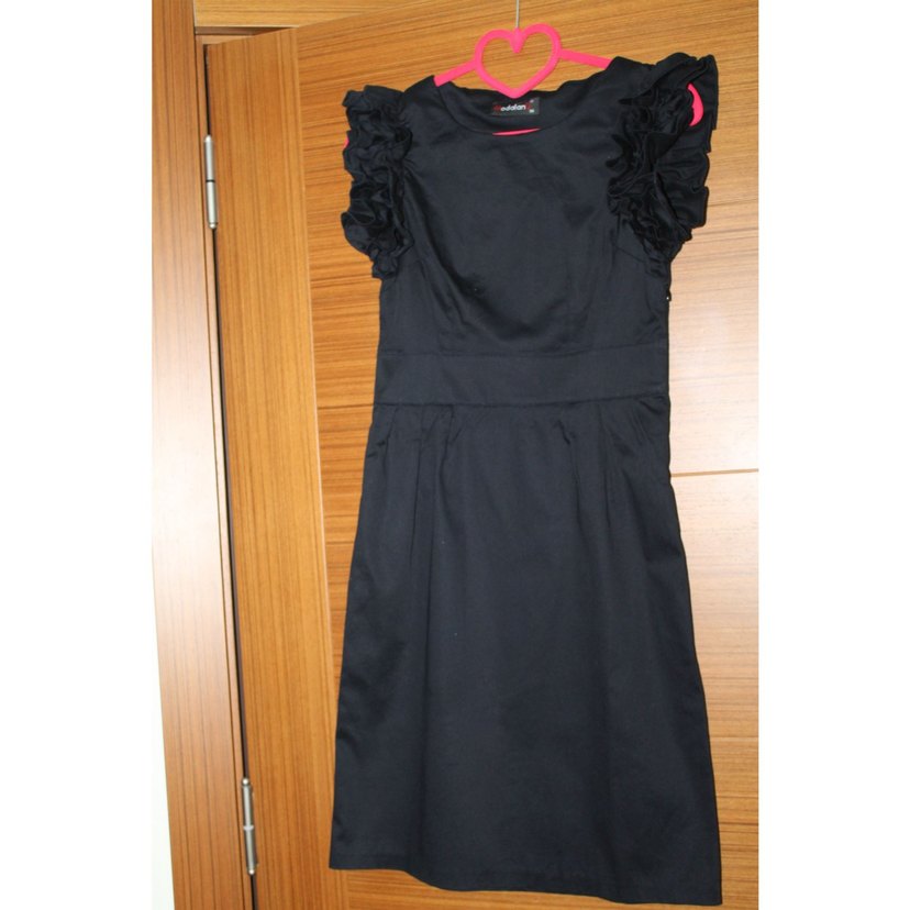 Kolsuz, fırfırlı omuzları ve yuvarlak yakası olan siyah, gövdeyi saran midi elbisedir. Ofis için uygundur. 34-36 bedene uygundur