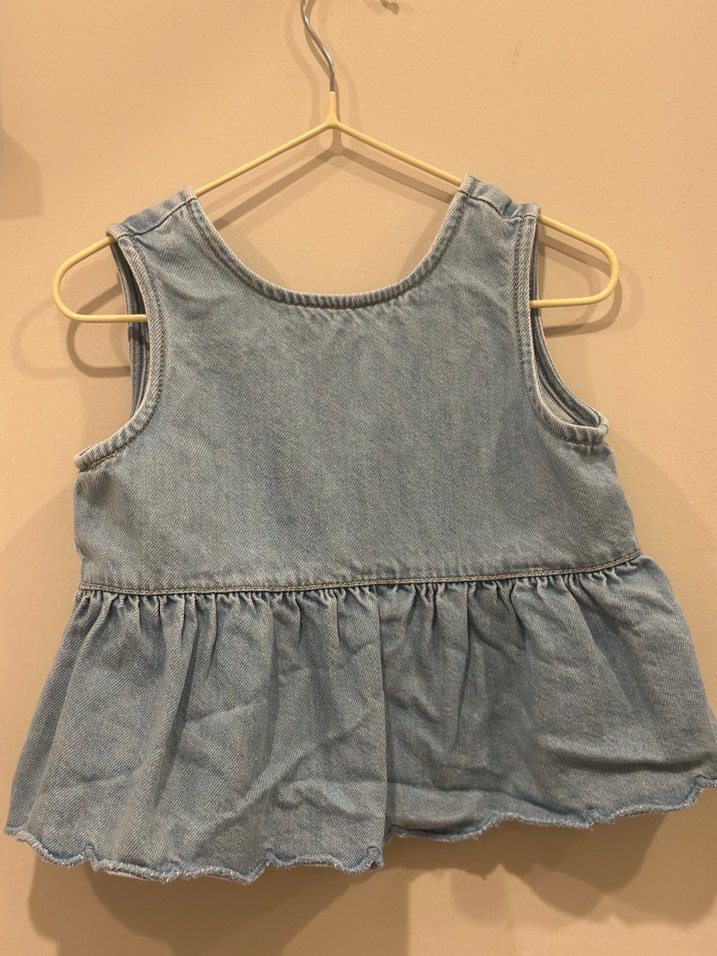 Kolsuz, bol kesim gri denim elbise, fırfır detaylı ve yuvarlak yakalı. Hafif batik desenli günlük tarzda kız elbisesi.