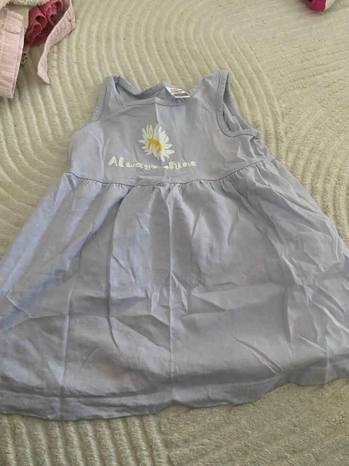 Kolsuz, gri keten kız elbisesi, bol kesim ve baskılı desen ile fırfır detayları içerir. Askısız yaka sade bir stil sağlar.