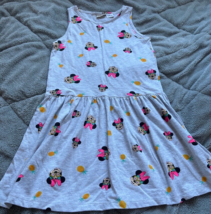 Kolsuz, gri renk kız elbisesi, bol kesim ve fırfır detaylıdır. Baskılı Minnie figürleri ve ananas desenleriyle süslenmiştir. Yumuşak sentetik kumaştan üretilmiştir.