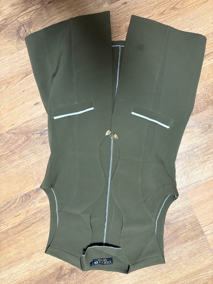 Kolsuz, fermuarlı hamile tulumu, yakası kesik ve midi boyda. Koyu haki renkte, sentetik kumaştan, dış mekan sokak stiline uygun.