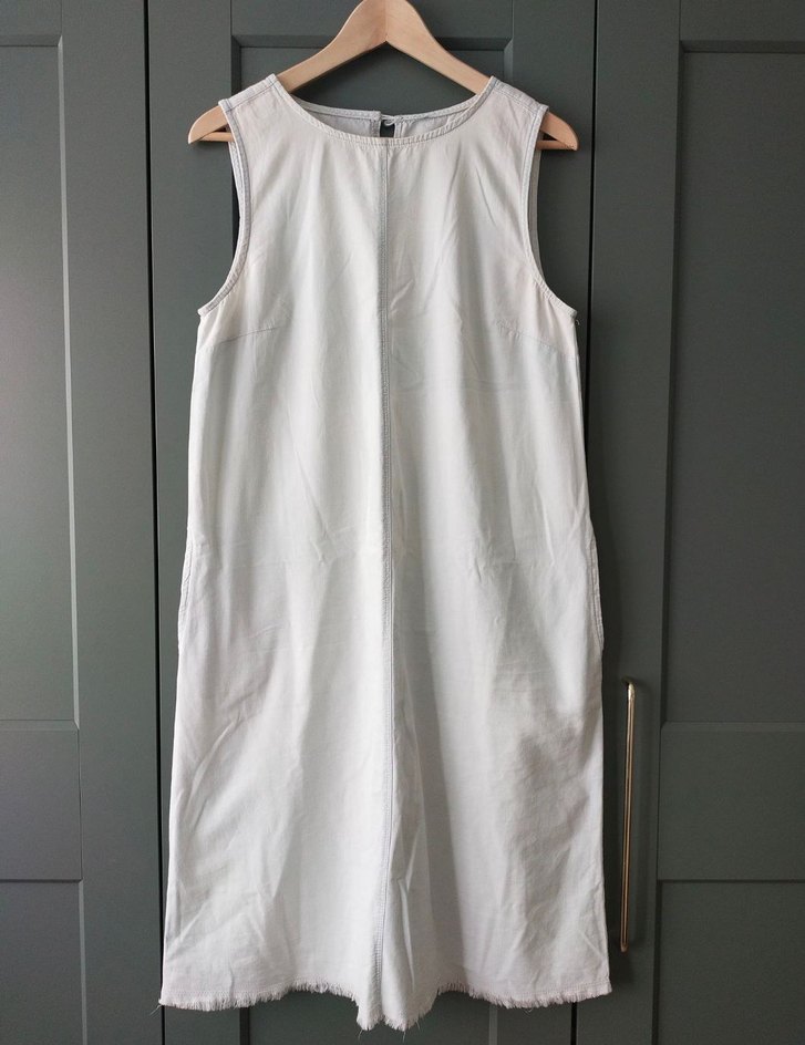 Keten kumaştan yapılmış, kolsuz midi hamile tulumu. Düz beyaz renkte, rahat kesim ve straplez yakaya sahip, günlük kullanıma uygun şık tasarım.
