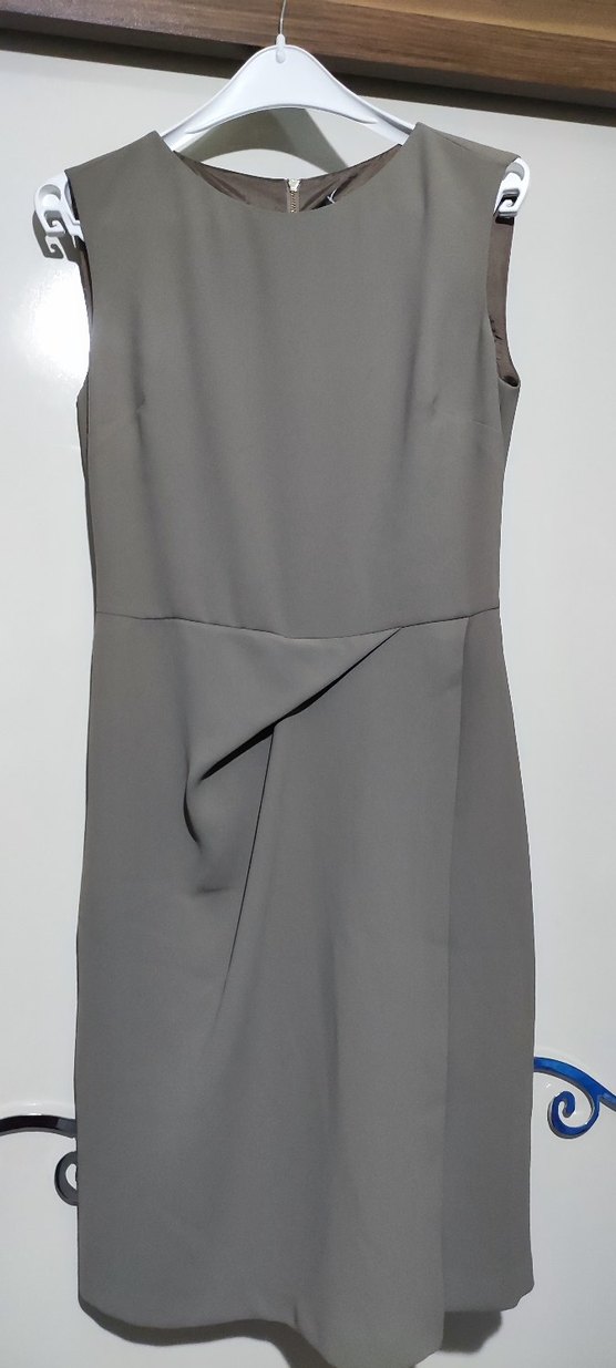 Kolsuz vizon midi elbise, yakalı ve drapeli detaylı, normal kesim ve minimalist tarzda, ofis kullanımı için uygun.