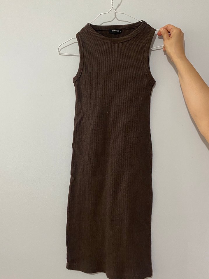 Kahverengi, kolsuz, yüksek yakalı ve midi boy keten kumaştan yapılmış, vücuda oturan sade elbise. Günlük sokak tarzı için rahat ve şık görünüme sahiptir. İade yoktur