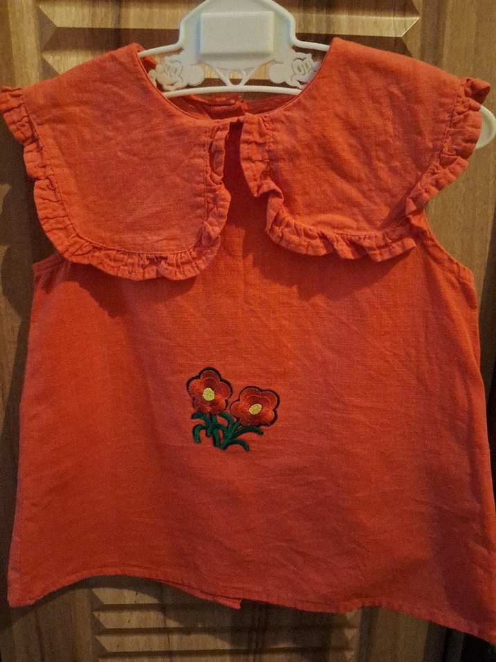 Kızlar için kolsuz kırmızı keten elbise, yakasında fırfır ve renkli işlemeli çiçek desenleri vardır. Bol kesim, bohem tarzda. Az kullanıldı önüne küçük tadilat yaptım birsey belli olmuyor