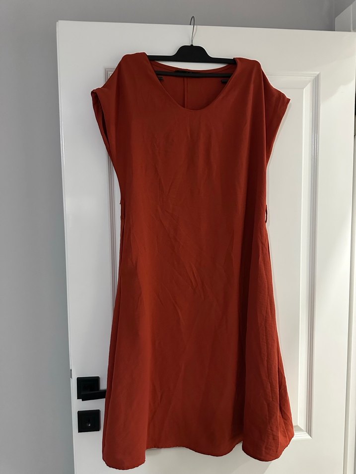 Kolsuz, keten midi elbise, V yaka ve bol kesim. Minimalist tarzda, koyu kırmızı renkte, günlük kullanım için uygun.